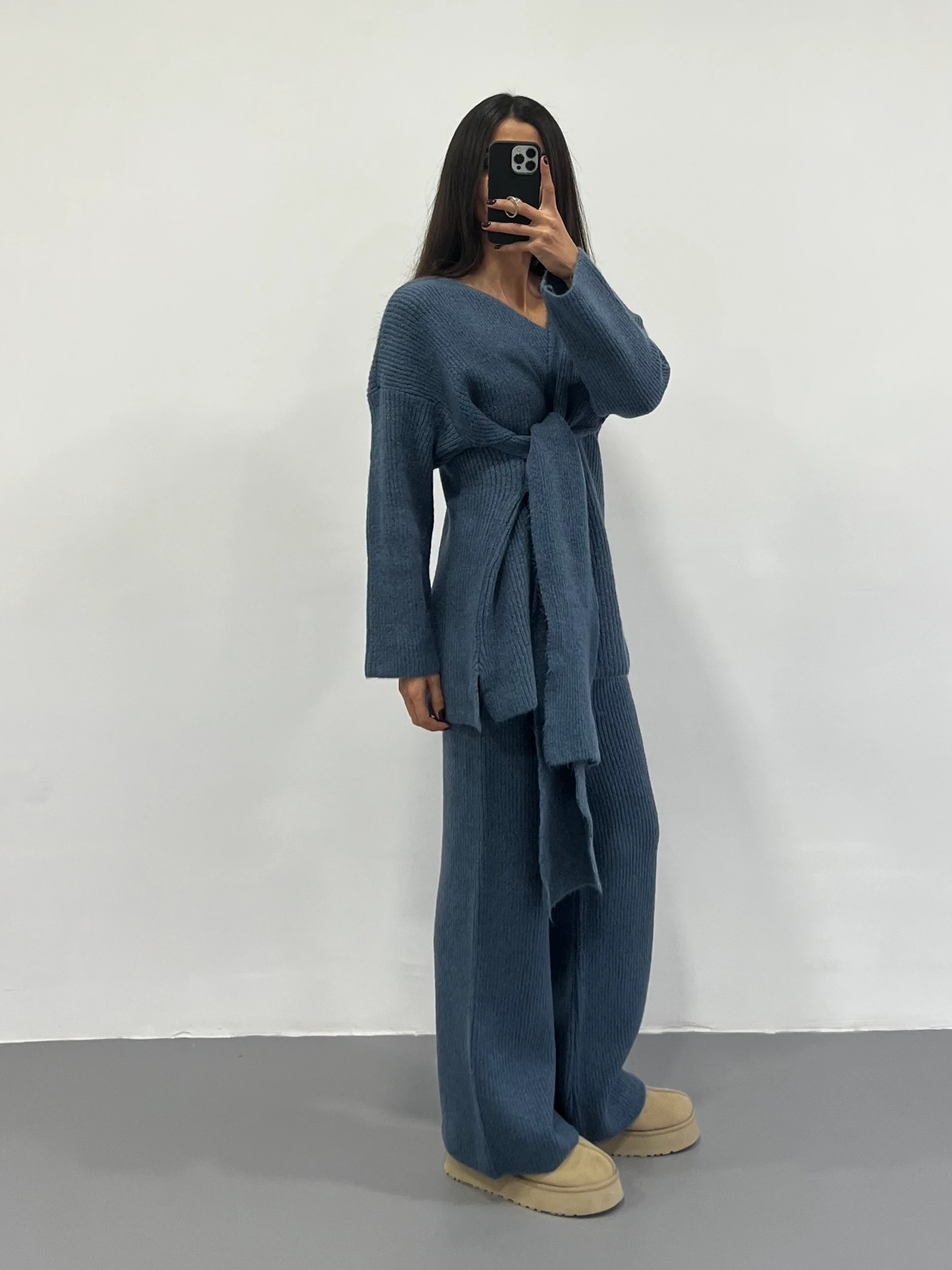 Tasarım Model, Kalın Örme Takım Kruvaze Yaka, Yandan Bağlamalı, Yan Etek Ucu Yırtmaç Detaylı Üst.